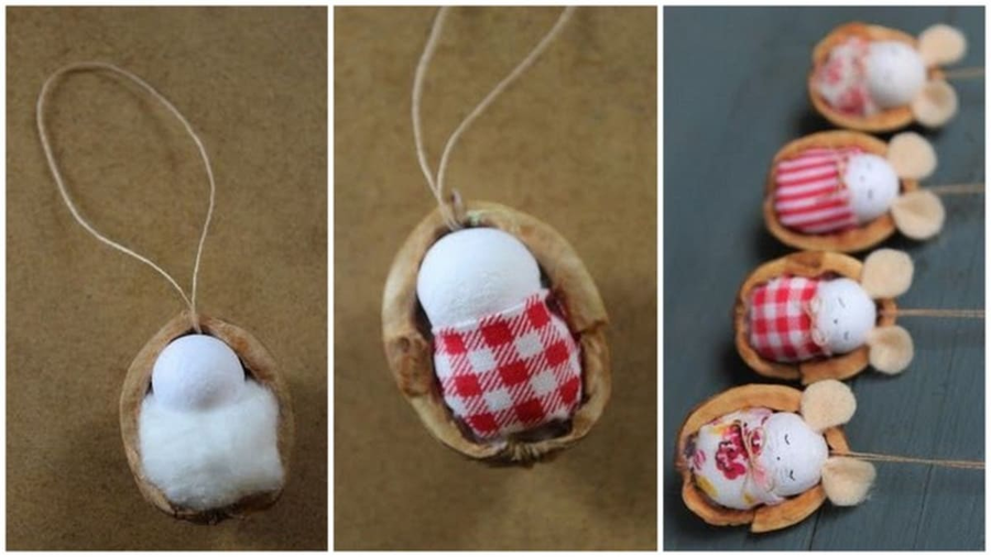 přilepíte provázek do oříšku, hlavičku vložíte lavičku a přilepíte, zbytek skořápky vyplňte vatou a překryjte kouskem bavlněné látky. Pak už jen fixou domalujte obličej a nalepte ouška.