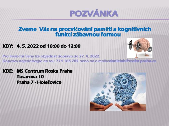 Procvičování paměti a kognitivních funkcí zábavnou formou se bude konat dne 04. 05. 2022 v MS Centru Roska PRAHA, Tusarova 1438/10, Praha 7 , od 10:00do 12:00 hod.