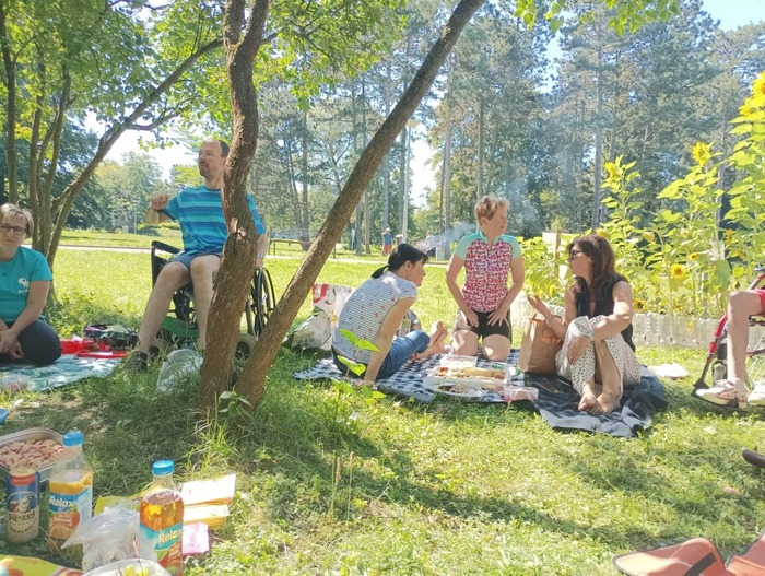 Celkem se sešlo 15 členů, karimatky i deky jsme si rozložili do kruhu ve stínu pod stromy. Každý přispěl na společný piknik nějakou svojí dobrotou - ovocem či zeleninou ze zahrádky, cuketovou nádivkou, ovocnými a makovými buchtami, jednohubkami... Snažili jsme se inspirovat i zdravou stravu např. formou pomazánky z červené řepy a křenu - nebyl to ovšem ten pravý "šálek kávy" pro každého .