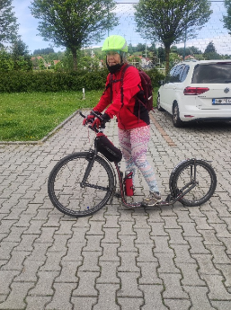 Posila z Brněnské Rosky, co má zdravé obě nožky. K dopravě na re kondičku přivezla si koloběžku.